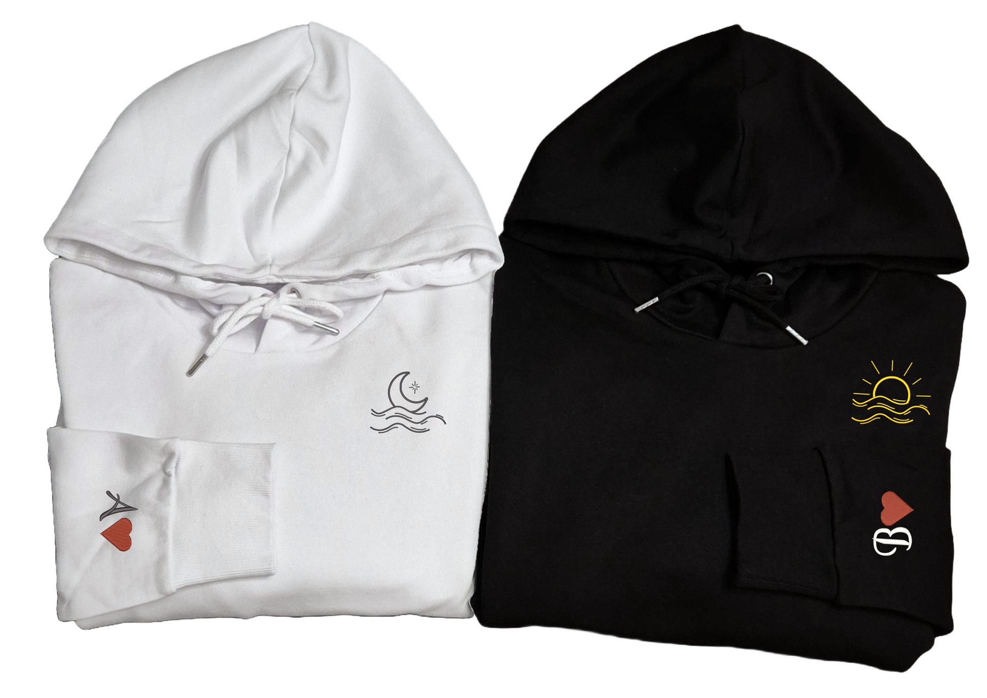 Ett parhoodie-set med broderade sol- och månmotiv, designade för att passa ihop. En fin present till Alla Hjärtans Dag.
