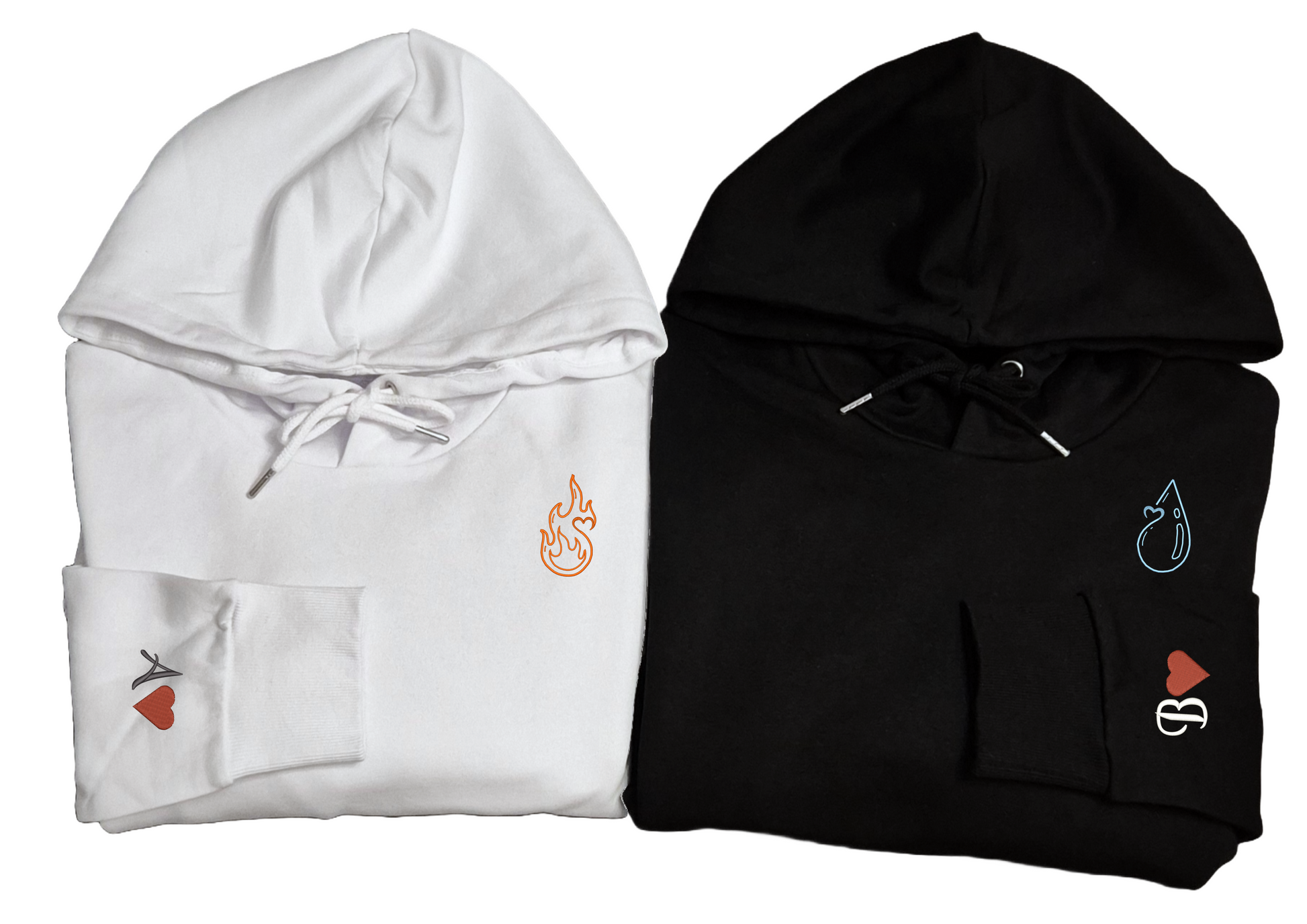 Ett parhoodie-set med broderade eld- och vattenmotiv som symboliserar styrka och balans i relationen. Perfekt som en personlig present till Alla Hjärtans Dag.