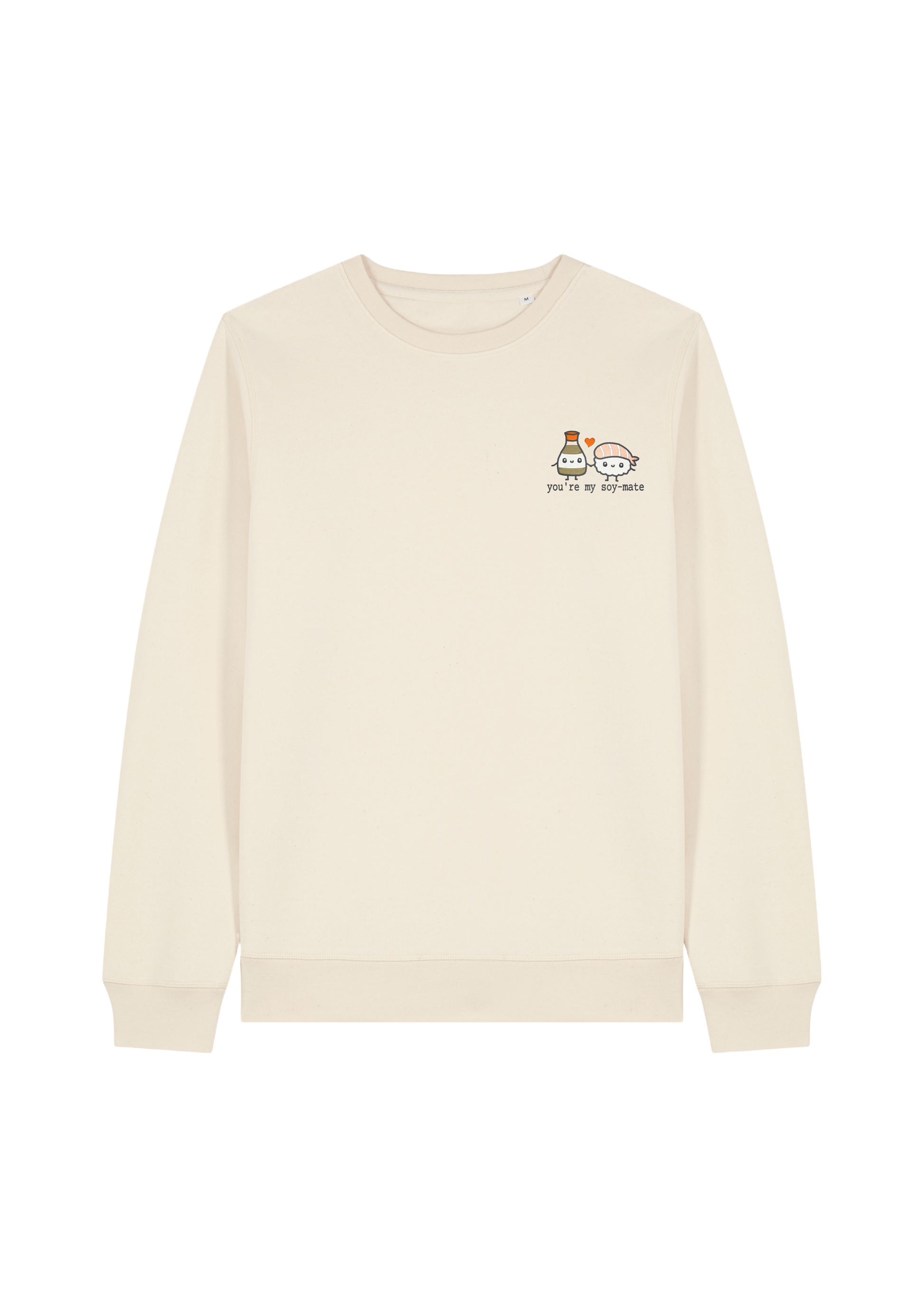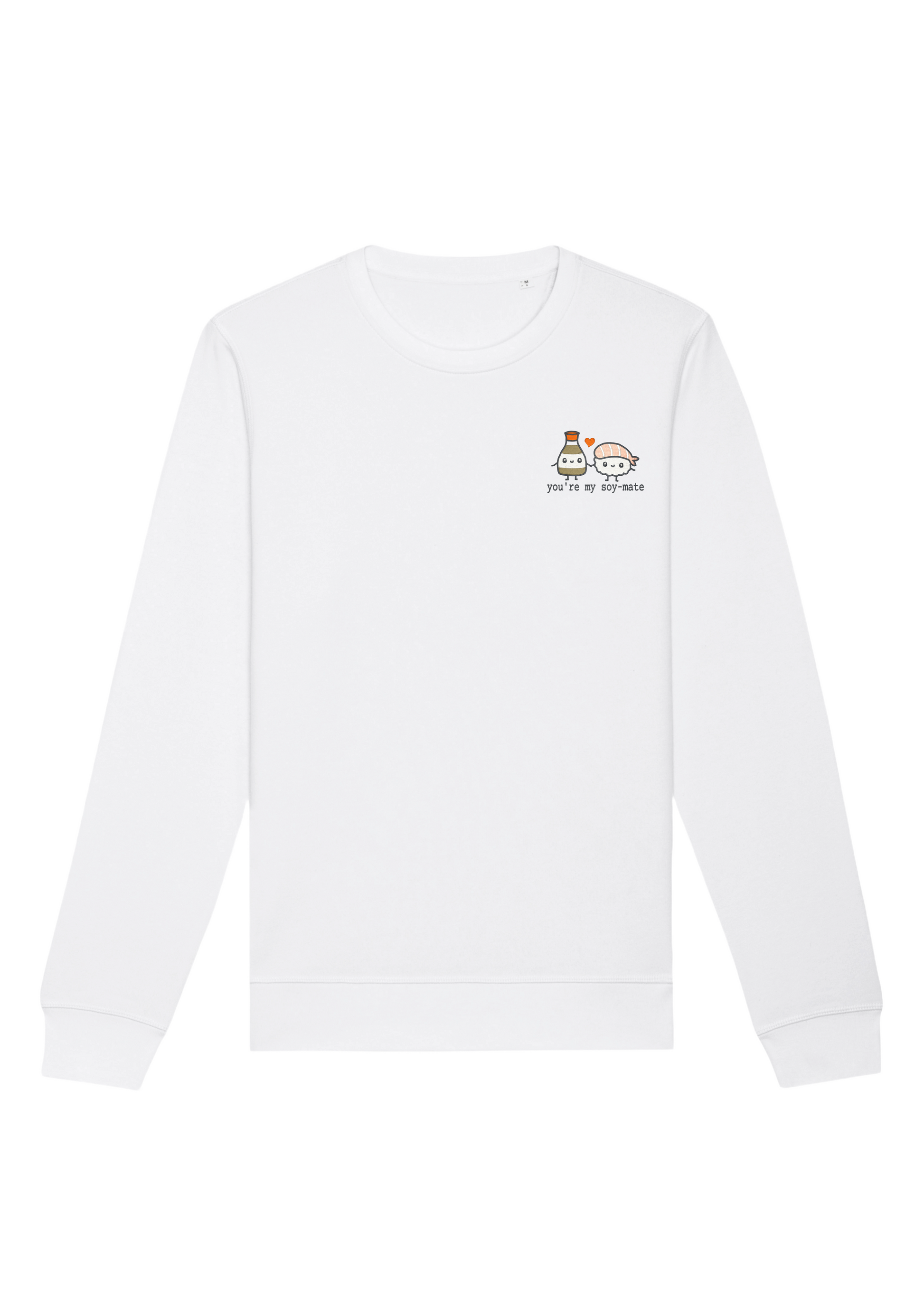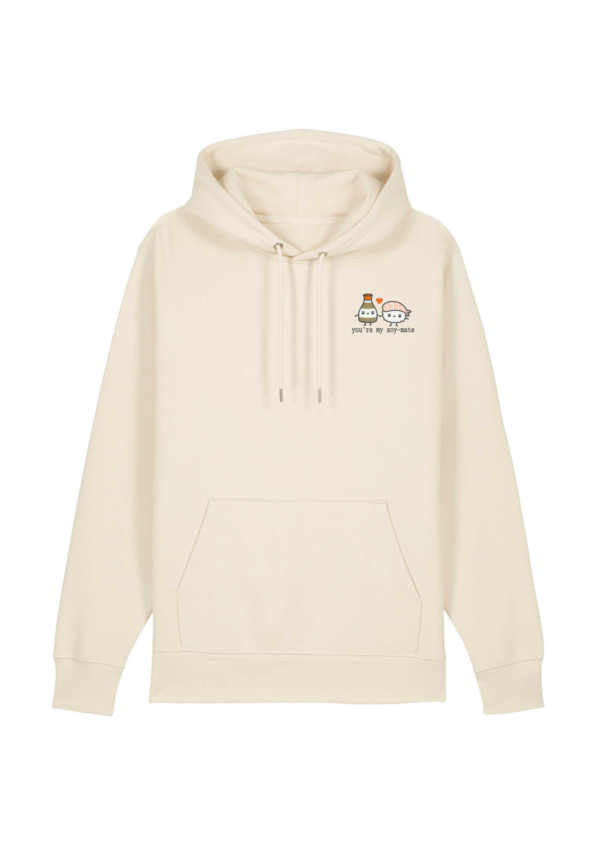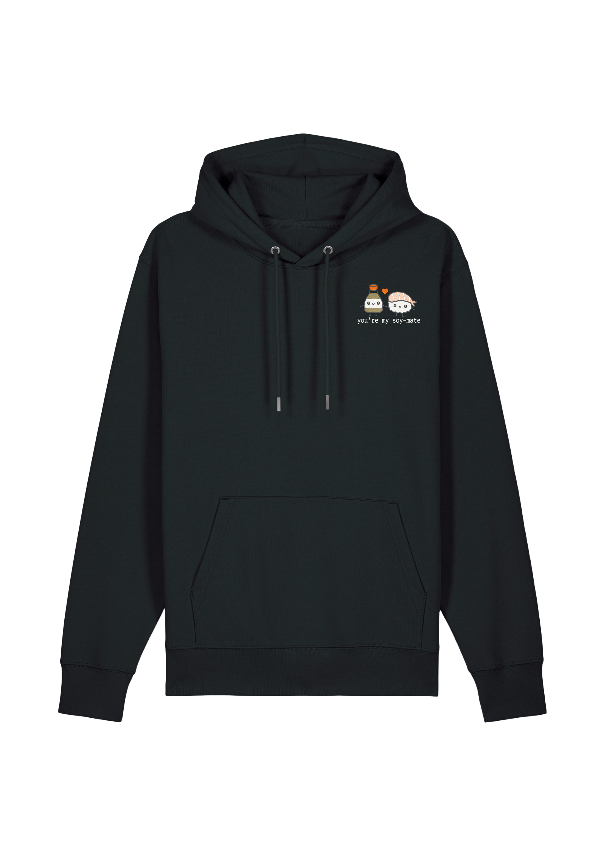 Ge en omtänksam och rolig present till din partner på Alla Hjärtans Dag. Den här hoodien eller sweatern har en broderad design med texten "You Are My Soy-Mate"